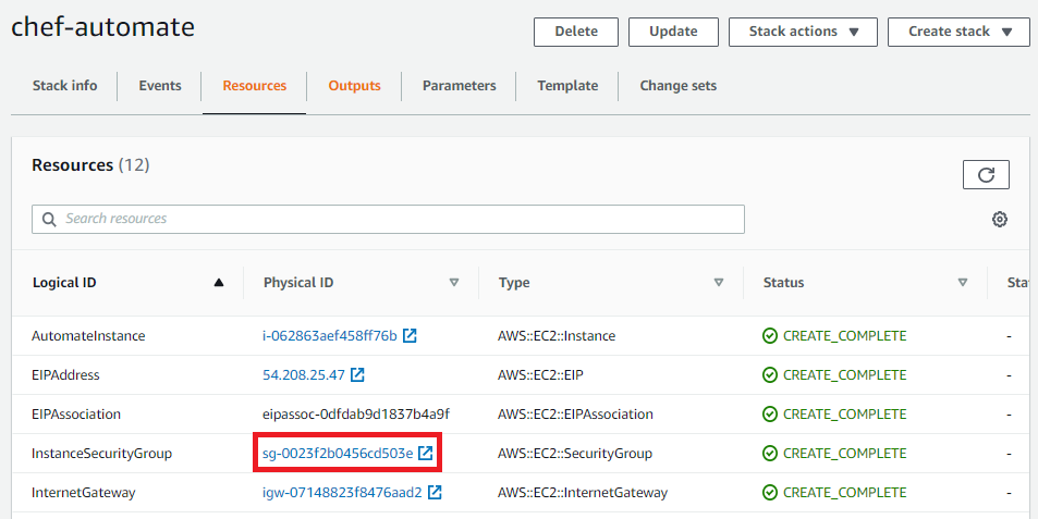 1. Select the Instance Security group in the Resources tab of your AWS Chef Automate deployment.
